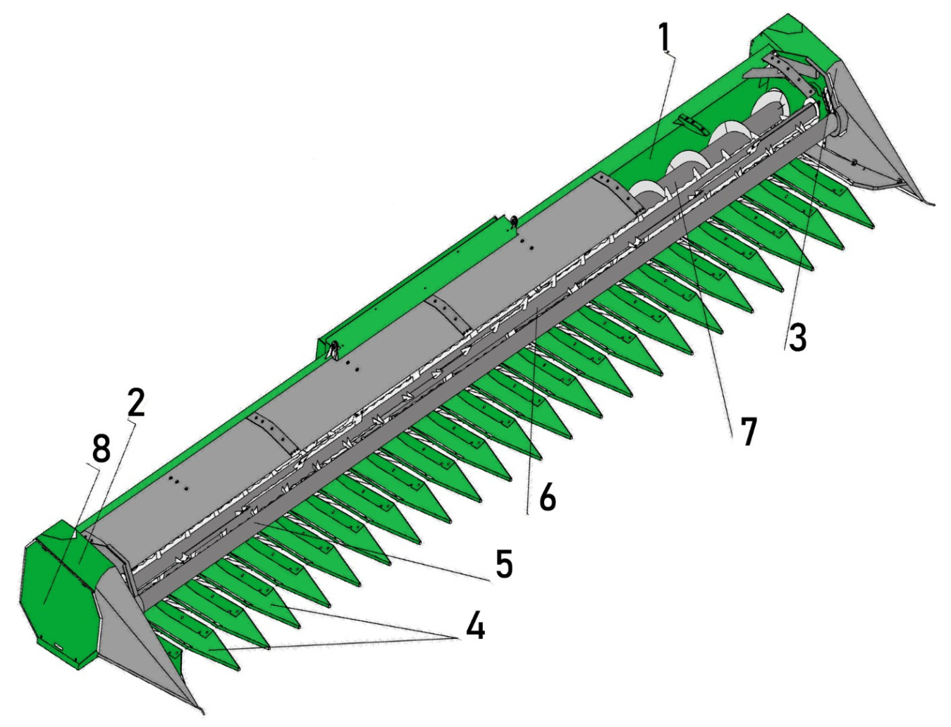 Платформа жниварки: 1) каркас жниварки; 2) права боковина; 3) ліва боковина; 4) стеблепідйомники; 5) обтічник; 6) мотовило; 7) шнек; 8) щиток захисний.