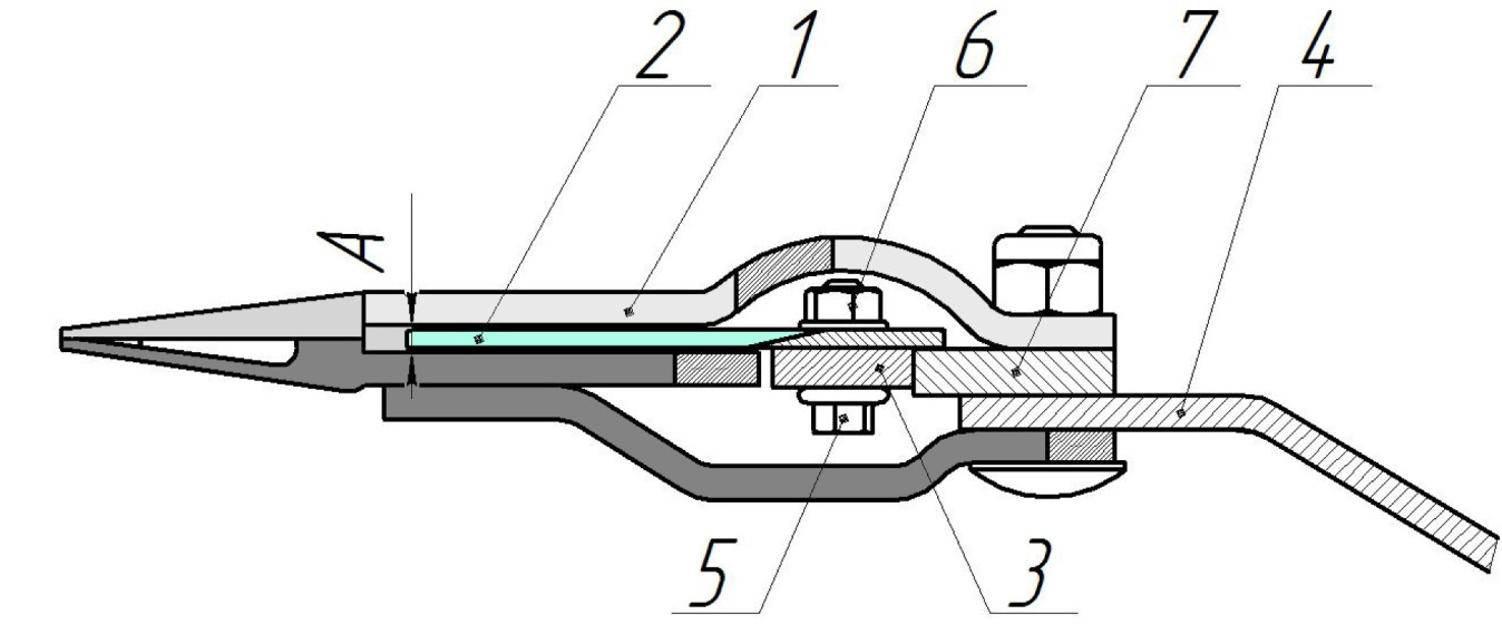 Ріжучий апарат: 1) палець подвійний; 2) сегмент; 3) спинка ножа; 4) брус ріжучий; 5) болт; 6) гайка; 7) напрямна планка; А) зазор пальця подвійного.