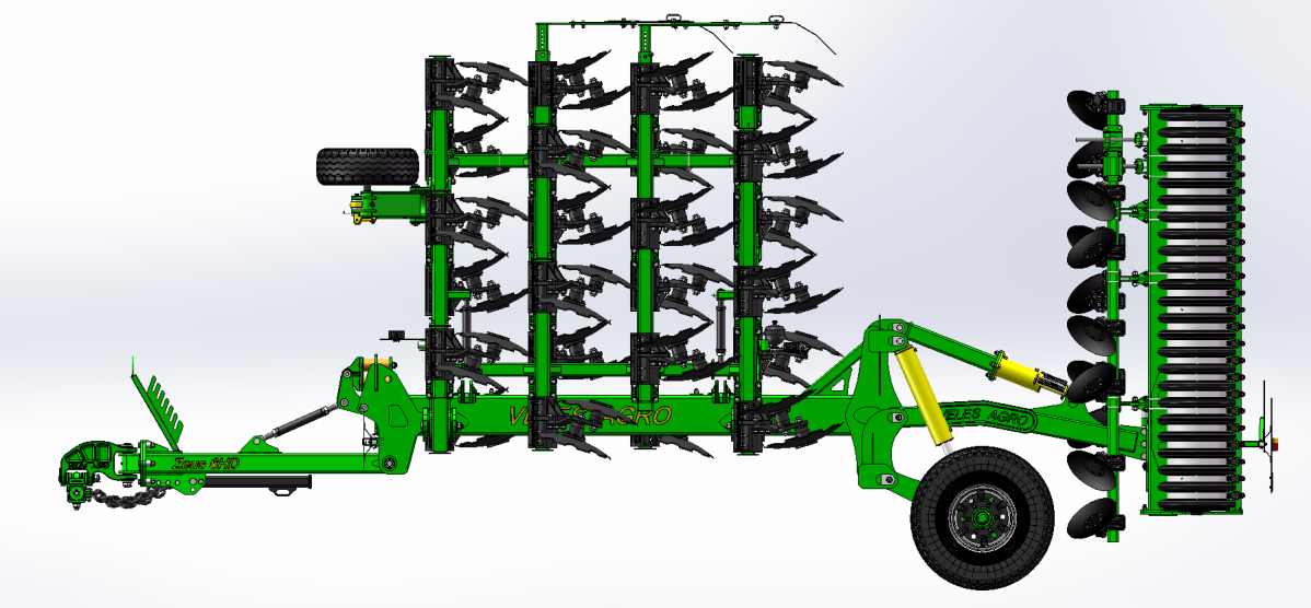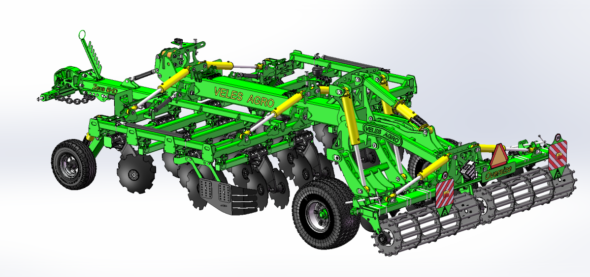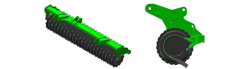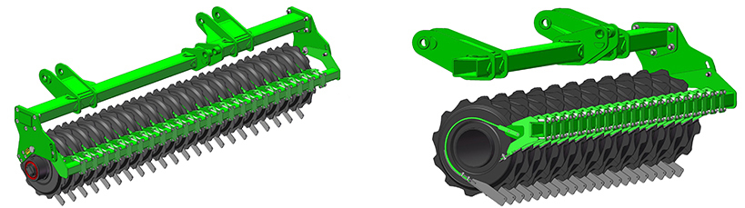 На робочій стійці закріплені два тандемних необслуговуваних робочих органи в шаховому порядку, а їх рознесення в чотири ряди, сприяє вільному перемішуванню ґрунту, без забивання агрегату, а коток що очищається, з вібруючими пластинами, ідеально вирівнює поверхню поля після проходження дисків.